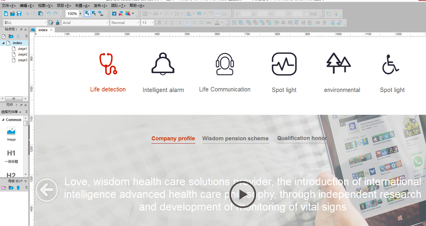 第二步:制作网页原型图。这是一个费脑活,目前大多数人都是采用Axure的软件制作,画原型图需要参考很多网站风格,通过不断的借鉴,才能总结自己的网站风格。目前设计流行的元素是采用图标配文字,界面扁平化,尺寸做成宽屏风格。在制作原型图的过程中,我们需要看很多的网站风格,如果你是要做外贸网站,那么你需要寻找很多国外大牌的网站,看一下他们的网站风格,才能很好的找到那种思维感觉。国内的网站相对来说还是比较保守一些,尽管也是扁平化设计,但是从布局上大多数网站是异曲同工。如图所示原型图制作:
